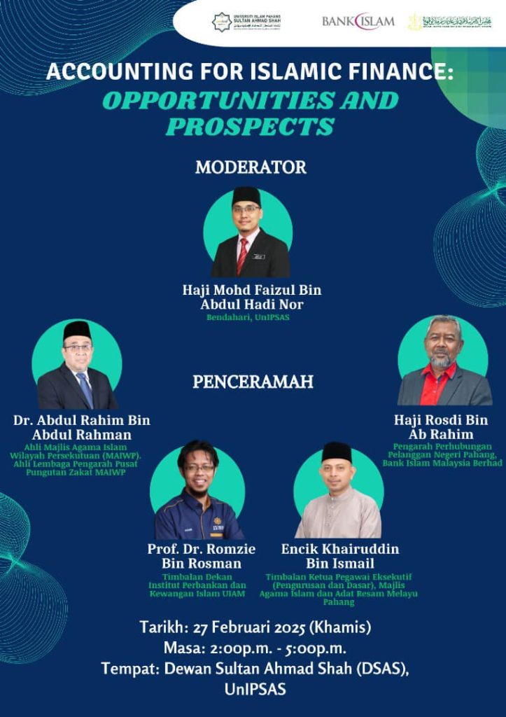 Kuantan, 27 Februari 2025 – UnIPSAS dengan kerjasama Majlis Ugama Islam dan Adat Resam Melayu Pahang (MUIP) dan Bank Islam Malaysia Berhad telah menganjurkan seminar “Accounting For Islamic Finance: Opportunities and Prospects”. Seminar ini bertujuan memberi pendedahan kepada pelajar mengenai peluang kerjaya dalam bidang Perakaunan dan kewangan Islam serta peranannya dalam sektor kewangan, perbankan, dan pengurusan zakat.