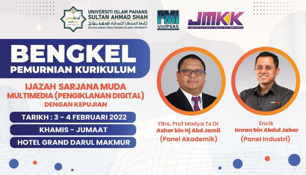 3-4 Februari 2022 (KUANTAN) - Bengkel Pemurnian Ijazah Sarjana Muda Multimedia (Pengiklanan Digital) yang diadakan di Hotel Grand Darul Makmur bertujuan bagi memantapkan dan penambahbaikan kurikulum sedia ada sebelum ini. Semakan dan penilaian bersama individu yang pakar dalam bidang multimedia iaitu YBrs. Prof Madya Ts Dr Azhar bin Hj Abd Jamil dari Universiti Teknologi Mara (UiTM) sebagai Panel Akademik dan Encik Imran bin Abdul Jabar dari Sifoo Art and Multimedia Training Center sebagai Panel Industri.