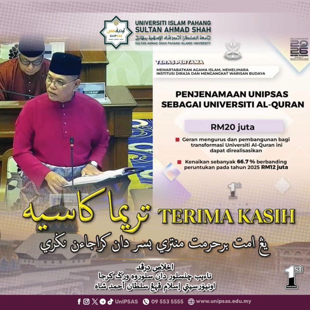 KUANTAN, 5 Disember 2025 - UnIPSAS menzahirkan penghargaan atas pengumuman peruntukan RM20 juta dalam Belanjawan Pahang 2026 bagi melaksanakan transformasi penjenamaan UnIPSAS sebagai Universiti Al-Quran.