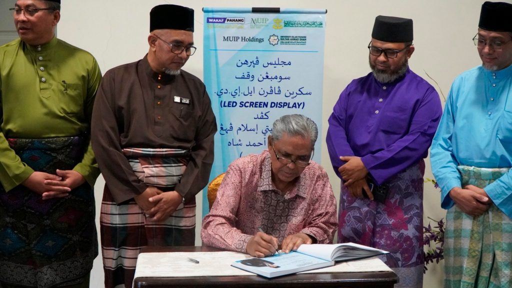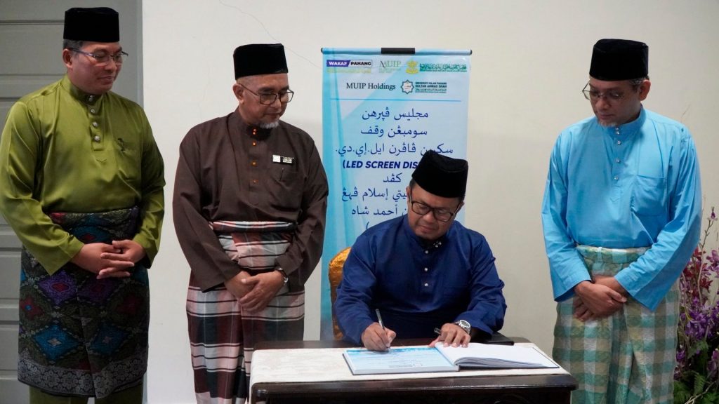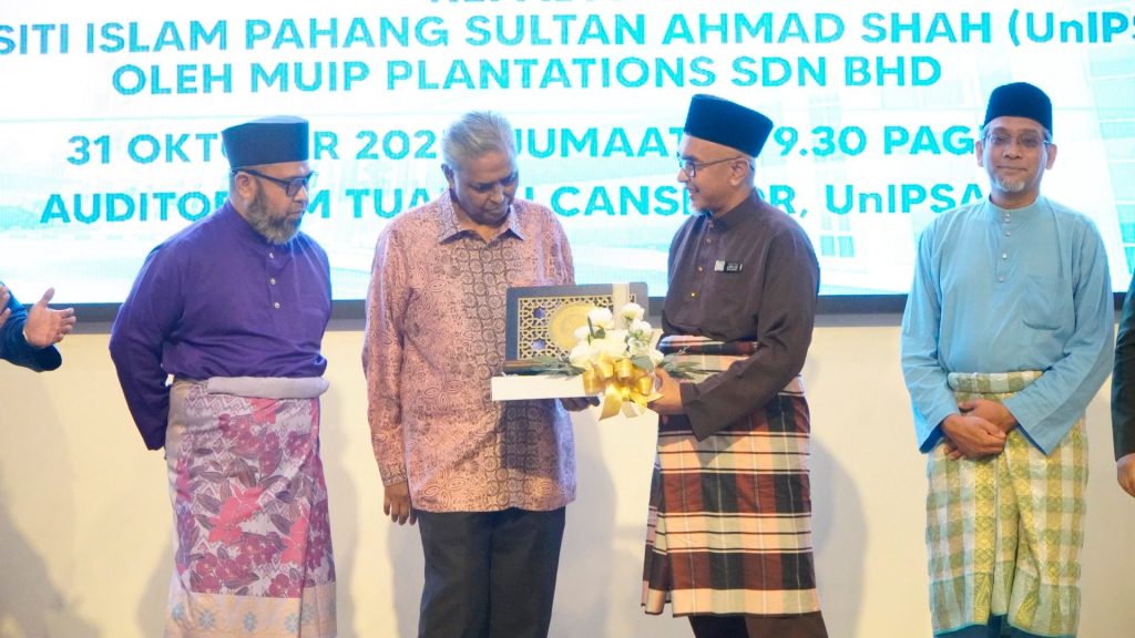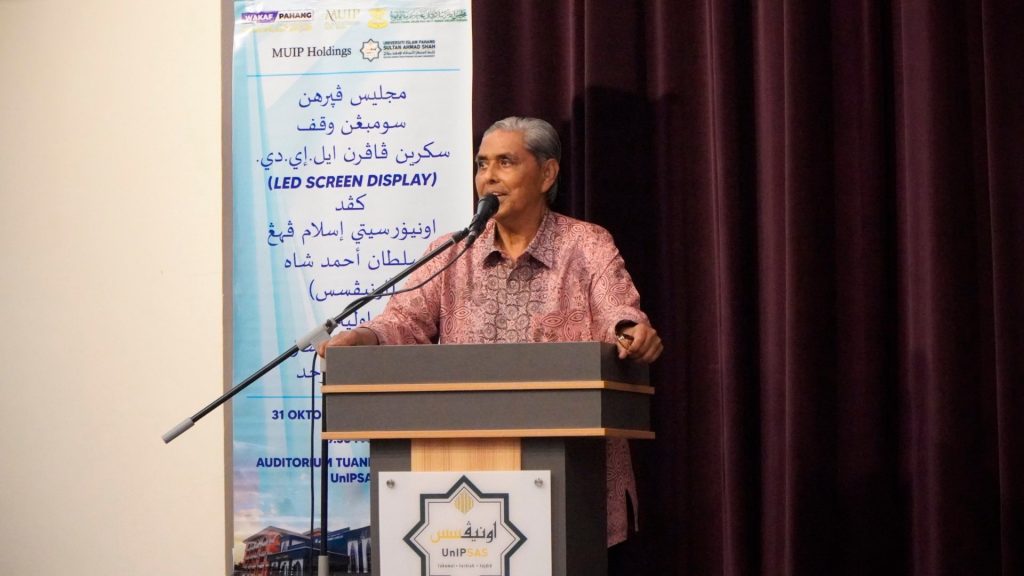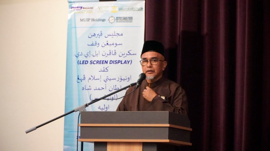 KUANTAN, 31 OKTOBER 2025 – Universiti Islam Pahang Sultan Ahmad Shah (UnIPSAS) hari ini melakar sejarah apabila menerima sumbangan wakaf Skrin Paparan LED (LED Screen Display) berteknologi tinggi daripada MUIP Plantations Sdn. Bhd. Majlis penyerahan yang diadakan di Auditorium Tuanku Canselor UnIPSAS ini menggariskan komitmen MUIP Plantations dalam melaksanakan tanggungjawab sosial korporat (CSR) untuk memajukan infrastruktur pendidikan melalui amalan wakaf.