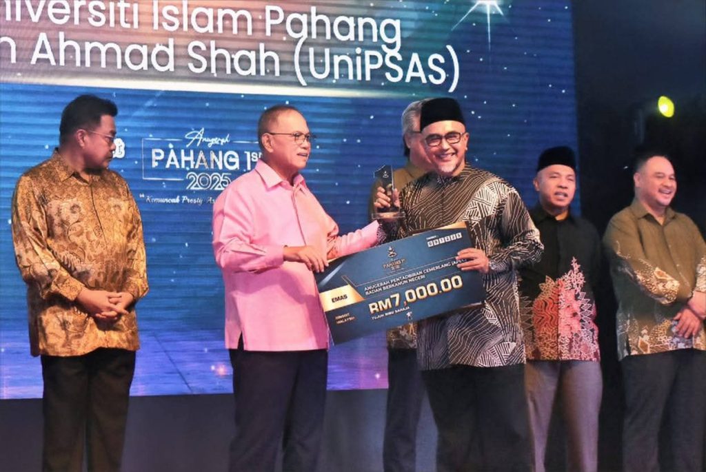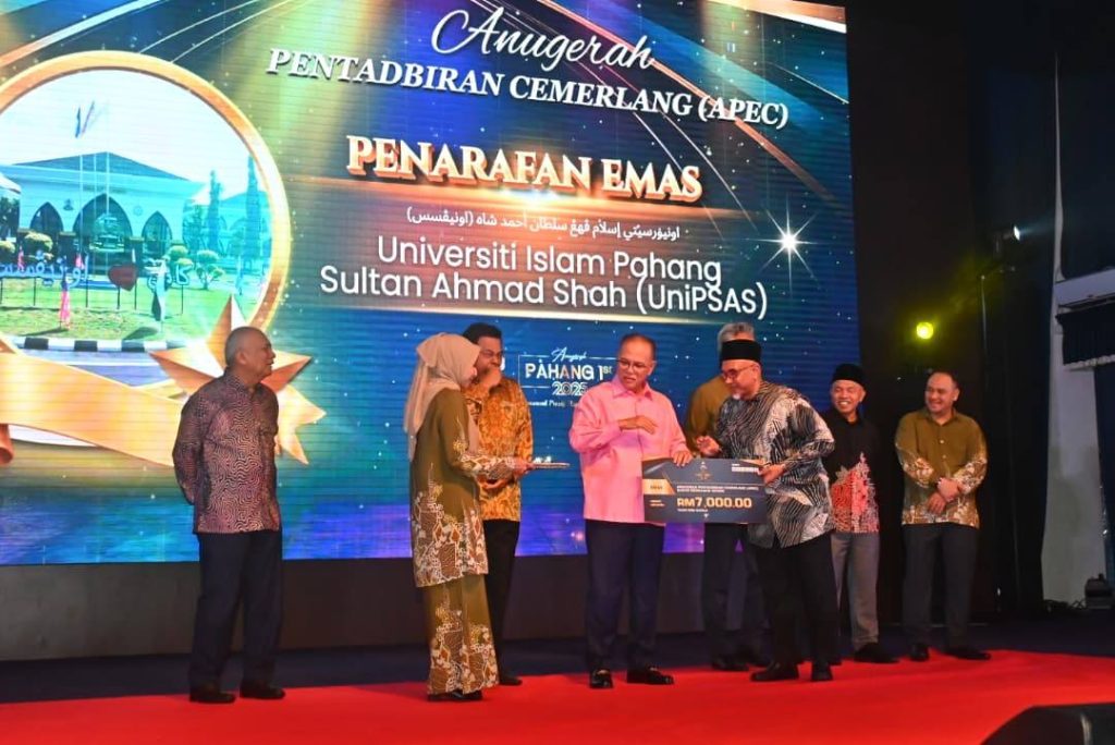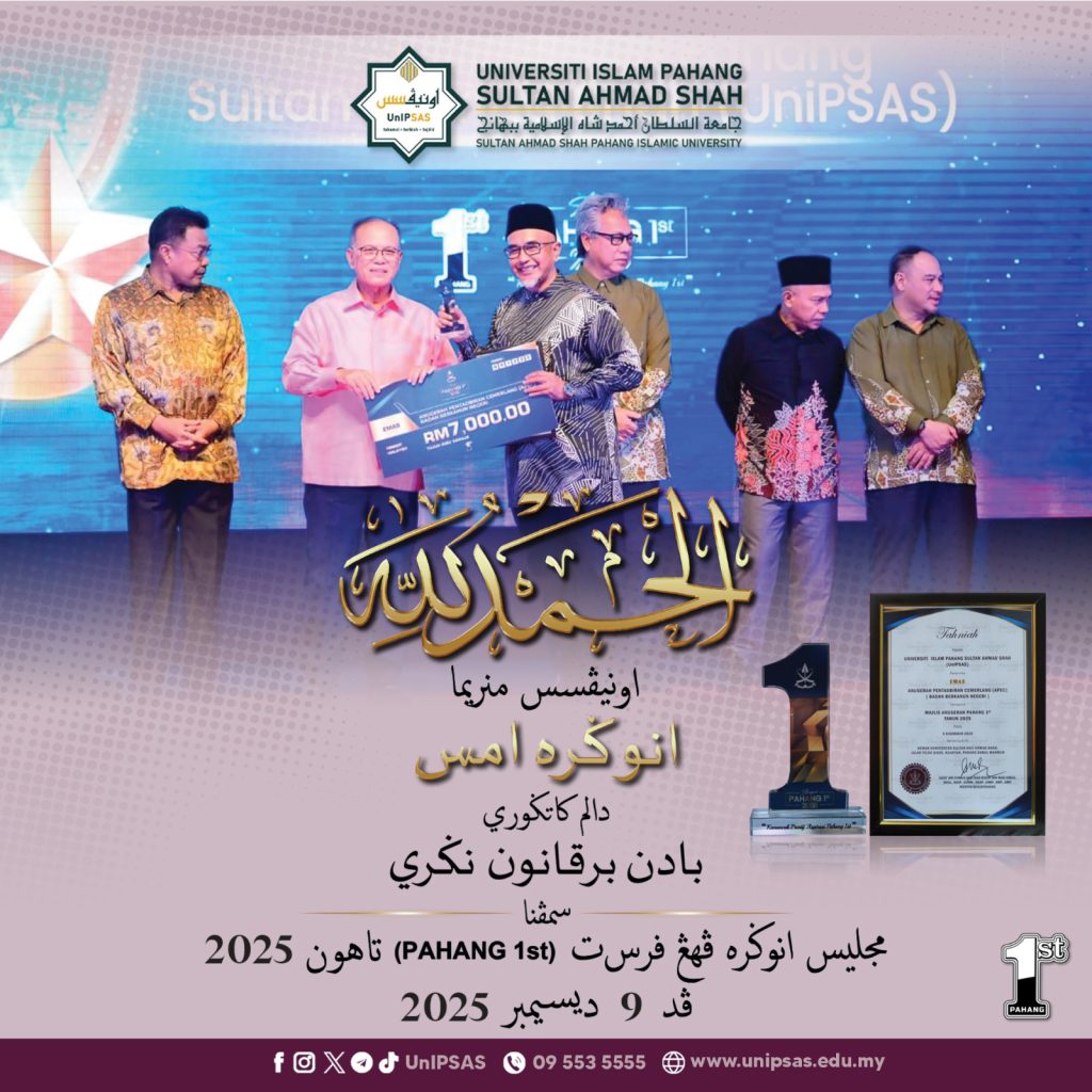 KUANTAN, 9 Disember 2025 — Universiti Islam Pahang Sultan Ahmad Shah (UnIPSAS) sekali lagi membuktikan kecemerlangannya apabila merangkul Pingat Emas bagi kategori Anugerah Pentadbiran Cemerlang (APEC) dalam Majlis Anugerah Pahang 1st 2025 yang berlangsung di Dewan Jubli Perak Sultan Haji Ahmad Shah malam tadi.
