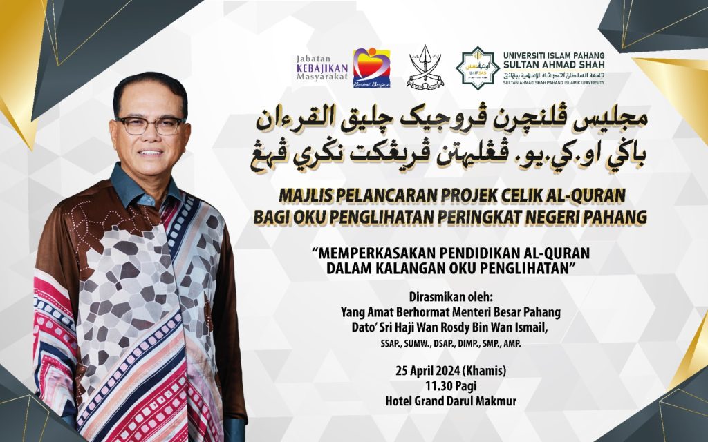 KUANTAN, 25 april 2024 - Kerajaan Pahang memperuntukkan RM1.2 juta bagi pembelian al-Quran braille untuk membantu golongan orang kurang upaya (OKU) penglihatan di negeri ini membaca al-Quran. Peruntukan melalui Jabatan Kebajikan Masyarakat (JKM) pada tahun lalu itu juga bagi membiayai penganjuran latihan yang bersesuaian termasuk kepada tenaga pengajar kelas pengajian al-Quran braille di Pahang.