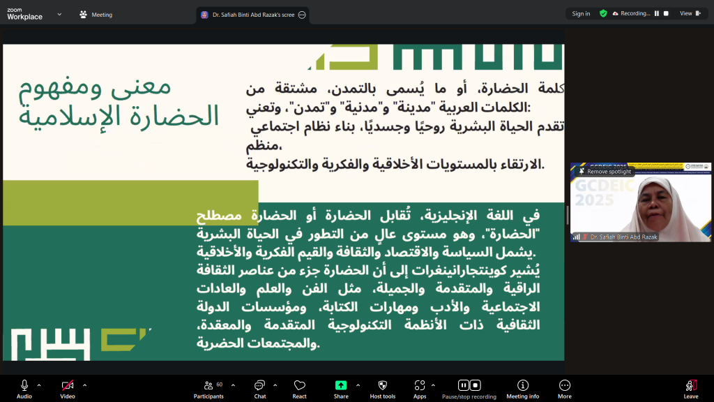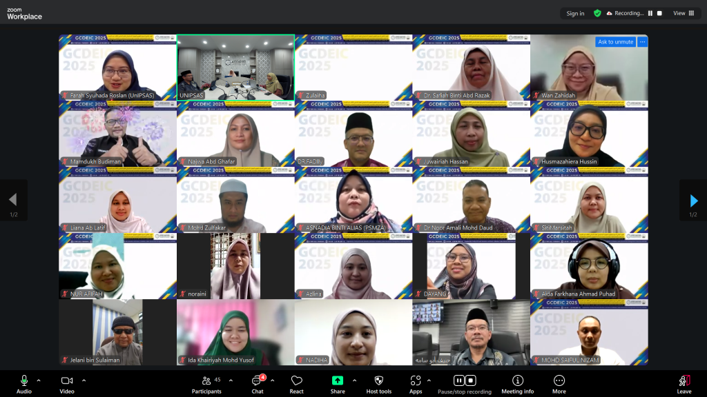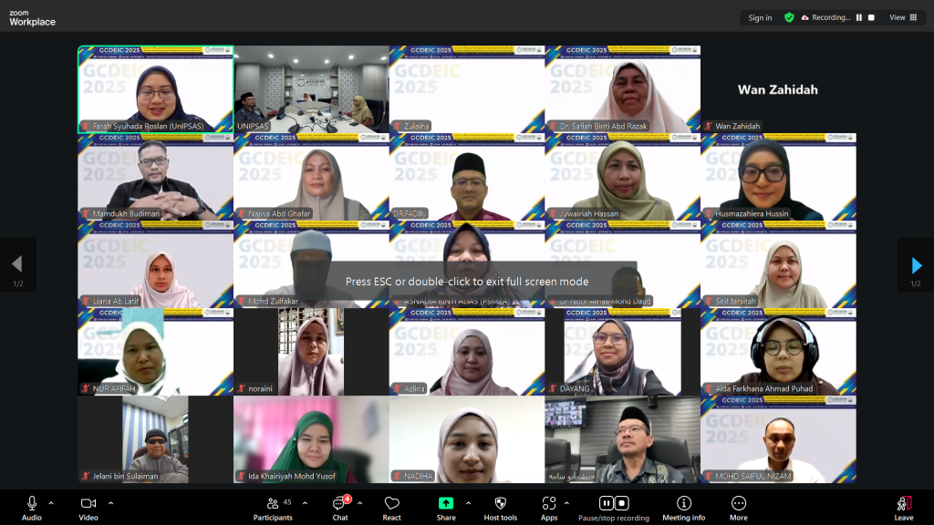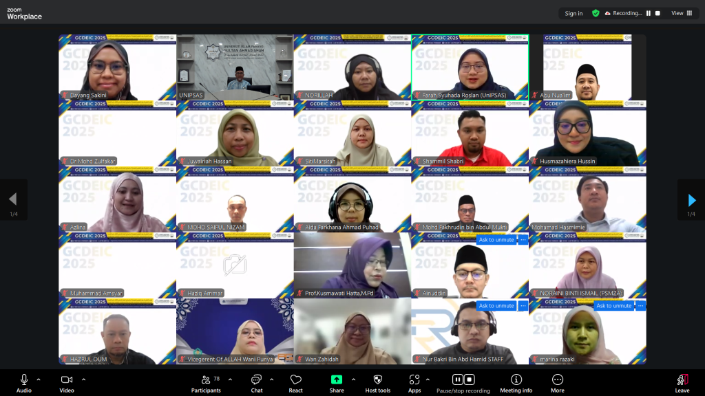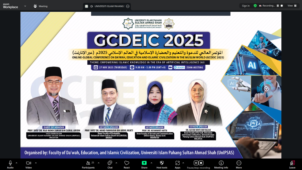 KUANTAN, 27 November 2025 – Persidangan Global Conference on Da’wah, Education and Islamic Civilization in the Muslim World (GCDEIC 2025) sedang belangsung secara dalam talian melalui platform Zoom, menghimpunkan para sarjana, ahli akademik dan penyelidik dari dalam dan luar negara bagi membincangkan isu dakwah, pendidikan serta ketamadunan Islam dalam konteks perkembangan kecerdasan buatan.