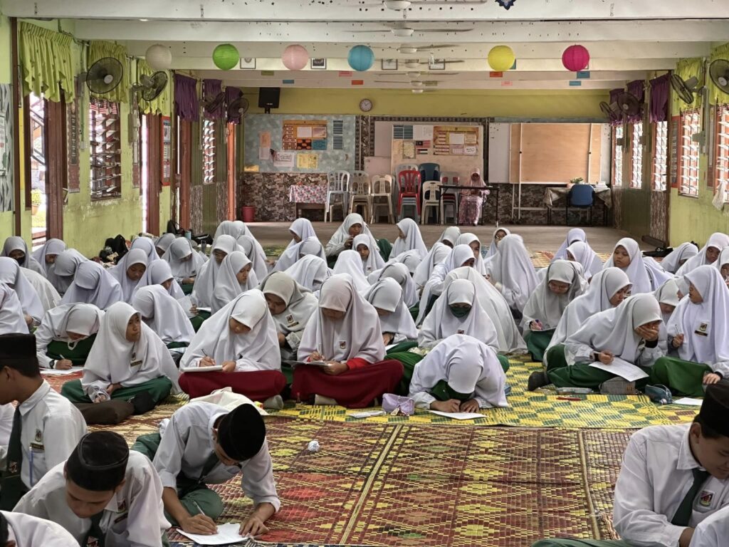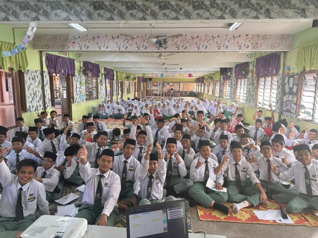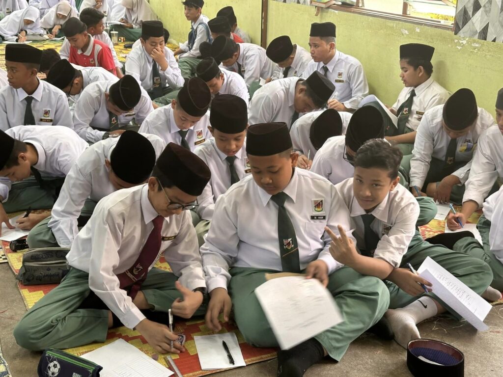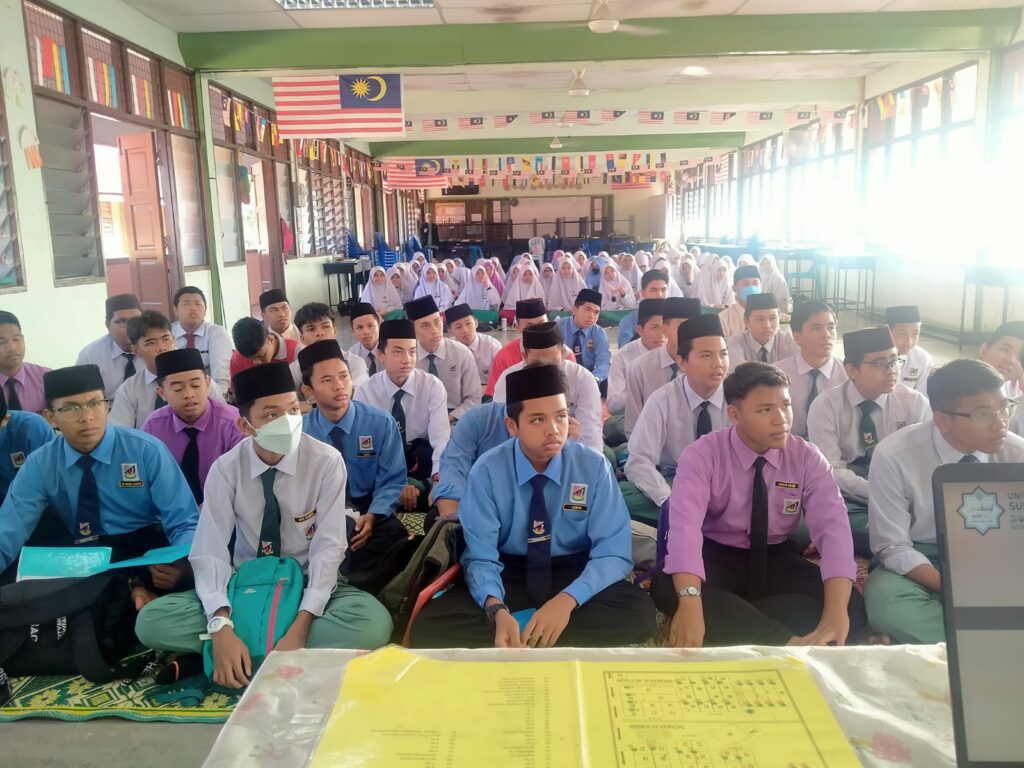 TEMERLOH, 31 JANUARI 2024 – Institut Jawi UnIPSAS telah dijemput oleh SMA Al-Khairiah, Temerloh untuk menyampaikan perkongsian kepada pelajar-pelajar tingkatan 1 dan 3 dalam program dinamakan Program Mahir Jawi. Program ini telah berlangsung selama dua hari iaitu pada 30 dan 31 Januari 2024 baru-baru ini. Para peserta dibahagikan kepada dua kumpulan besar di dua dewan yang berbeza melibatkan pelajar tingkatan 1 seramai 225 orang dan pelajar tingkatan 3 seramai 170 orang.