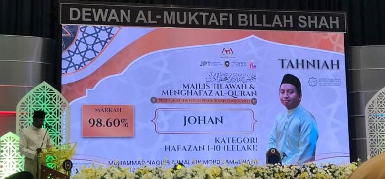 Pada peringkat akhir pertandingan, beliau telah dinobatkan sebagai Johan dalam Kategori Hafazan 1-10 iaitu dengan mendapat markah keseluruhan berjumlah 98.60%. Kemenangan ini adalah hasil usaha beliau dalam mendalami dan cinta kepada Al-Quran. Sesungguhnya kemenangan ini adalah suatu kebanggaan buat UnIPSAS dan semoga ianya menjadi ikutan kepada pelajar lain pada masa akan datang. Turut hadir sama mengiringi beliau pada majlis penutup dan penyampaian hadiah Majlis Tilawah dan Menghafaz Al-Quran Peringkat Institusi Pendidikan Tinggi 2023 (MTHQIPT2023) pada 29 September 2023 ialah Encik Abi Sofian bin Abdul Aziz, Penolong Pendaftar Bahagian Hal Ehwal Pelajar & Alumni UnIPSAS.