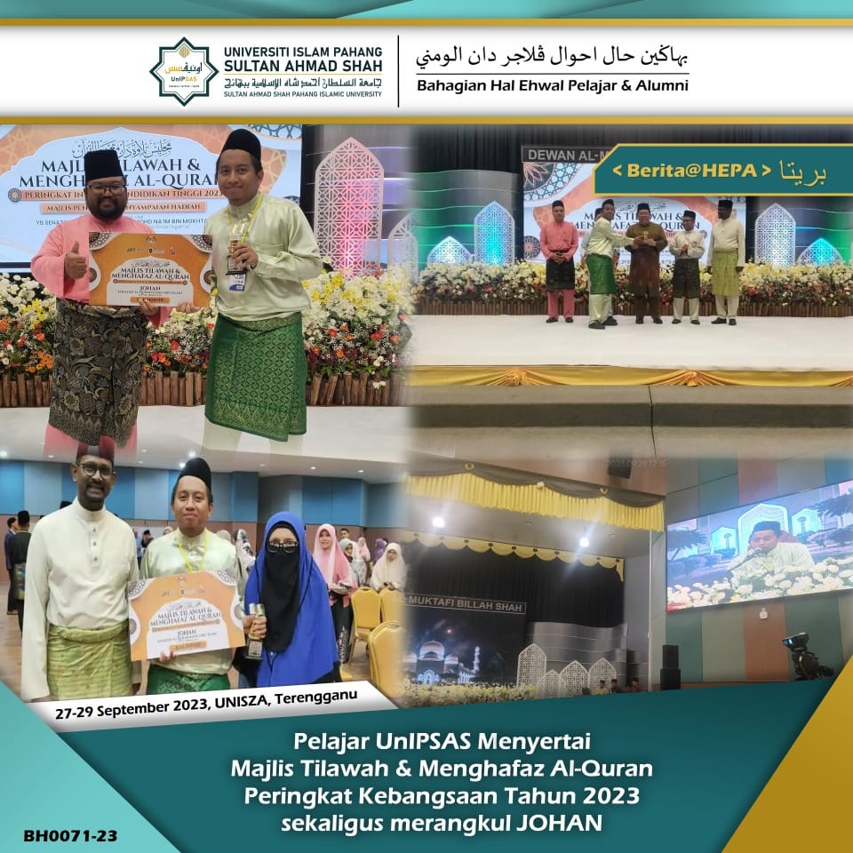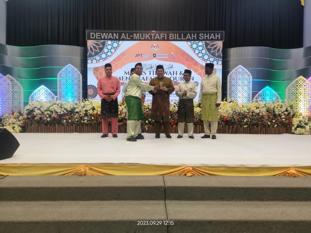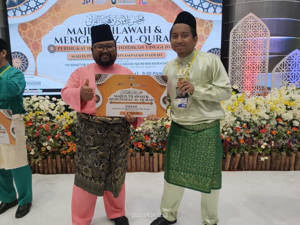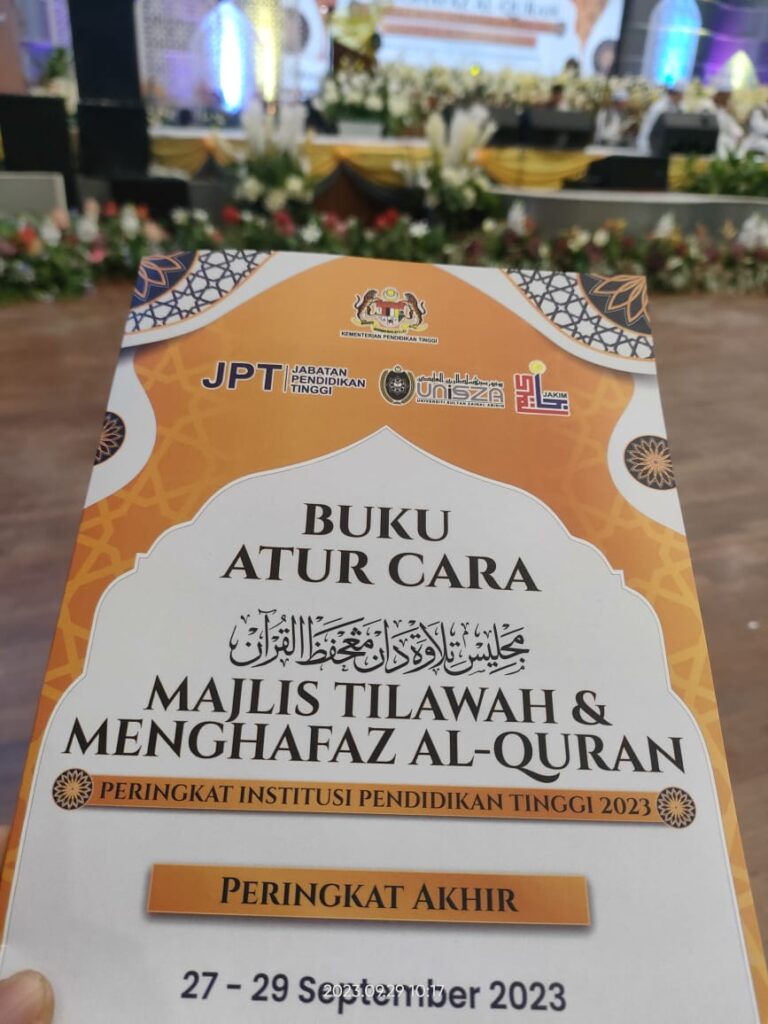TERENGGANU , 29 September 2023 - Kementerian Pendidikan Tinggi (KPT) dengan kerjasama Universiti Sultan Zainal Abidin (UnISZA) dan Jabatan Kemajuan Islam Malaysia (JAKIM) telah mengadakan Pertandingan Akhir Majlis Tilawah dan Menghafaz Al-Quran Peringkat Institusi Pendidikan Tinggi 2023 (MTHQIPT2023) pada 25-29 September bertempat di Dewan Al-Muktafi Billah Shah, UnISZA Kampus Gong Badak, Kuala Nerus Terengganu.