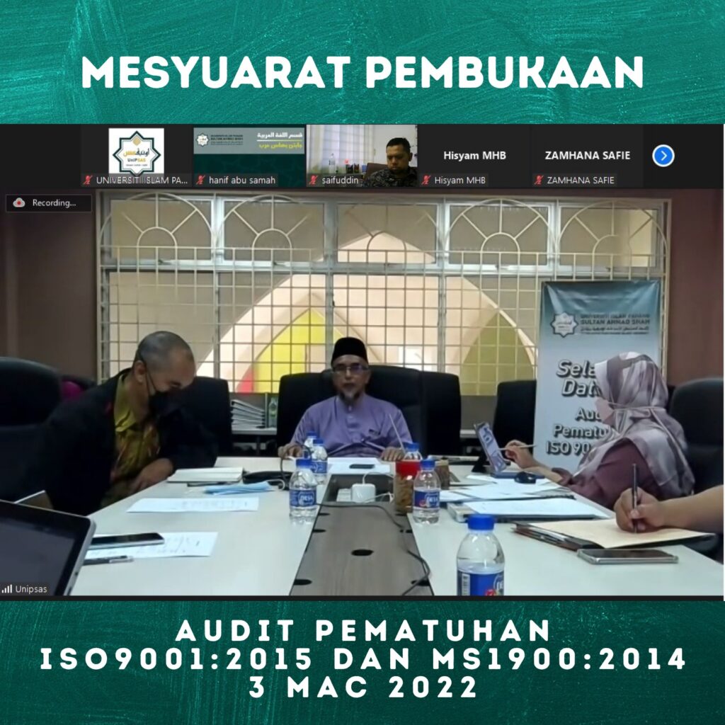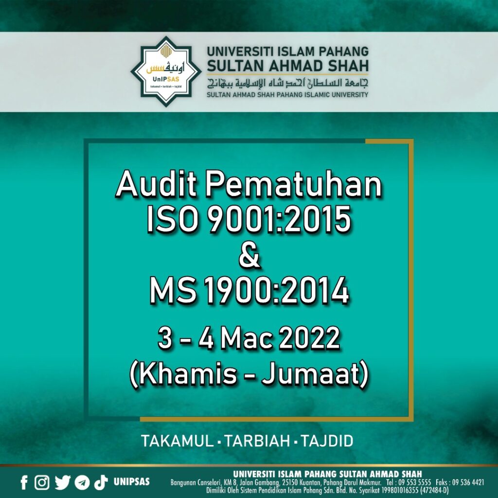 3 MAC 2022 (KUANTAN) - UnIPSAS akan menjalani Audit Pematuhan MS 1900:2014 dan ISO 9001:2015 selama dua hari bermula hari ini dan berakhir esok.