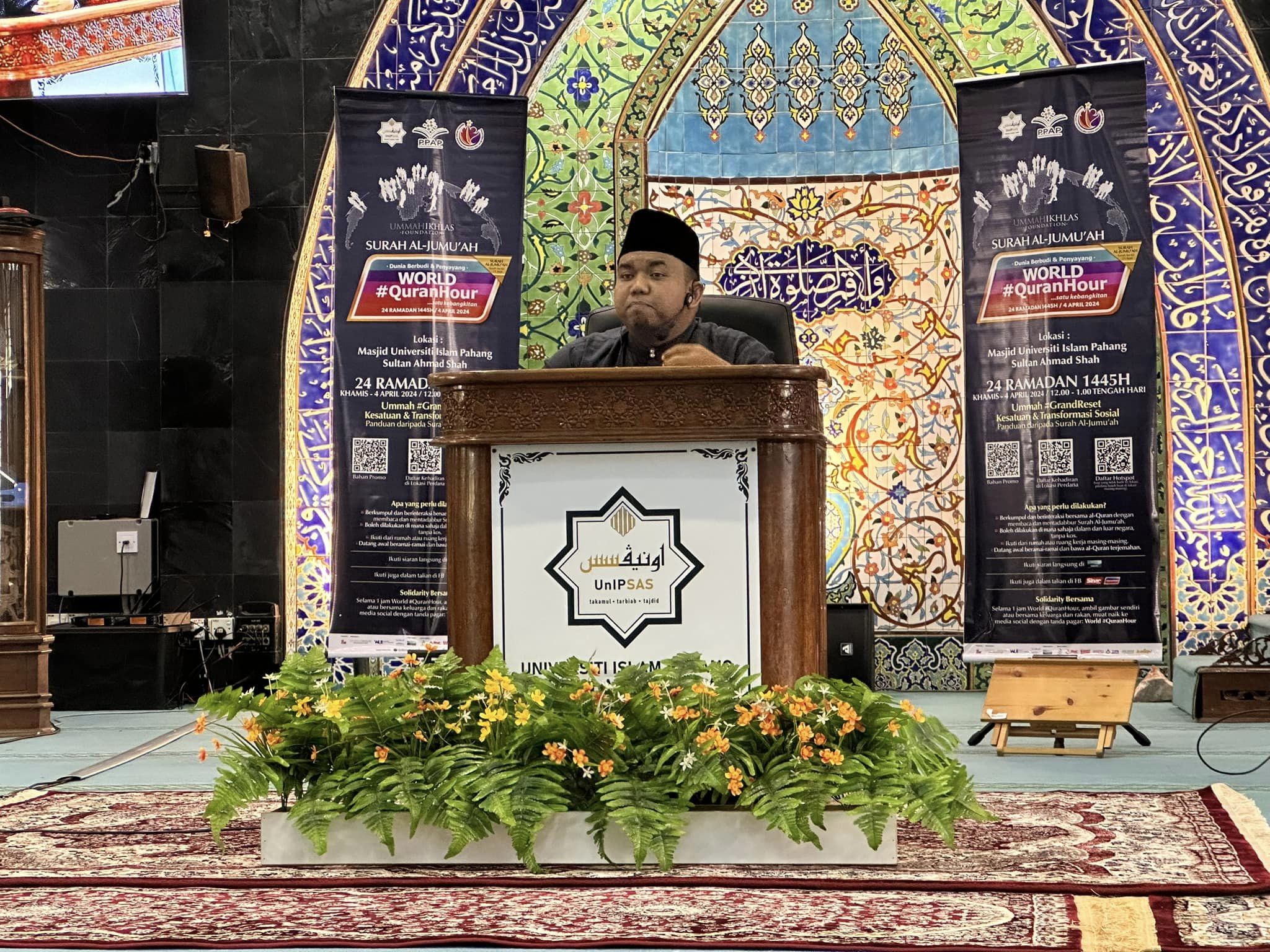 KUANTAN, 04 APRIL 2024 - Bersempena dengan Bulan Ramadan kali ini, mari kita bersama-sama menyambut World Quran Hour yang akan diadakan di Masjid Universiti Islam Pahang Sultan Ahmad Shah (UnIPSAS). Program telah diadakan pada 24 Ramadan 1445H bersamaan 4 April 2024, jam 12 hingga 1 petang secara serentak di seluruh Negara.